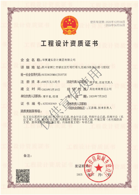 公司成立以来先后获得了工程设计资质十余项,含工程设计市政行业乙级、工程设计农林行业(农业工程)乙级、工程设计电力行业乙级、工程设计风景园林工程专项乙级、工程设计化工石化医药行业乙级、工程设计建筑行业乙级、工程设计环境工程专项(固体废物处理处置工程)乙级、工程设计环境工程专项(污染修复工程)乙级、工程设计环境工程专项(水污染防治工程)乙级、工程设计冶金行业乙级。获得工程勘察岩土工程专业乙级、工程勘察工程测量专业乙级资质。拥有市政公用工程专业乙级、电力工程专业乙级、房屋建筑工程专业乙级、机电安装工程专业乙级四项工程监理专业资质。